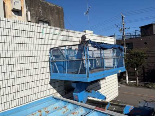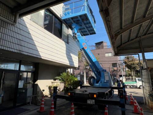 後日、高所作業車を使用して外壁全体の打診調査を実施しました。