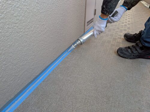 全面一気に接着剤を塗布すると居住者様が通行できなくなるので