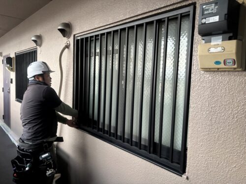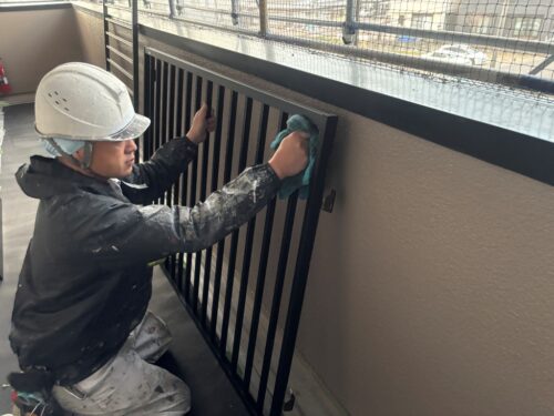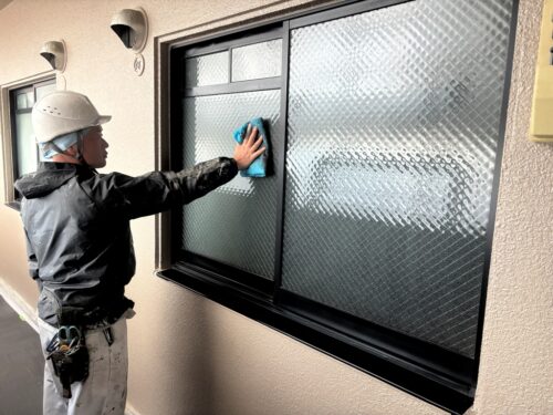 足場を解体する前に、サッシや面格子などの非塗装の清掃をしていきます